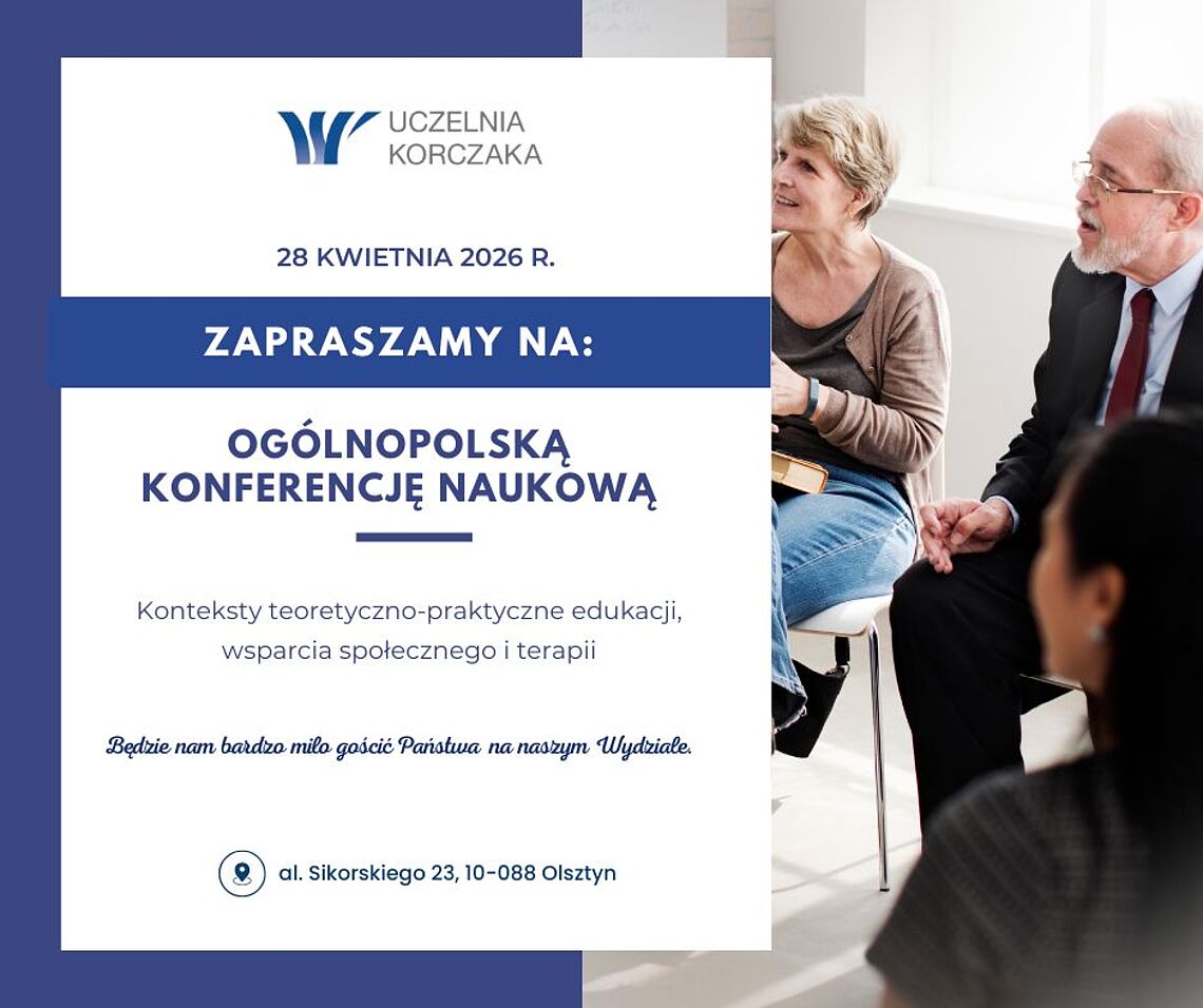 Wydział Nauk Humanistyczno-Społecznych Uczelni Korczaka w Olsztynie zaprasza do udziału w Ogólnopolskiej Konferencji Naukowej „Konteksty teoretyczno-praktyczne edukacji, wsparcia społecznego i terapii”, która odbędzie się 28 kwietnia. Wydarzenie skierowane jest do badaczy, praktyków oraz przedstawicieli instytucji działających w obszarach edukacji, pomocy społecznej i terapii.